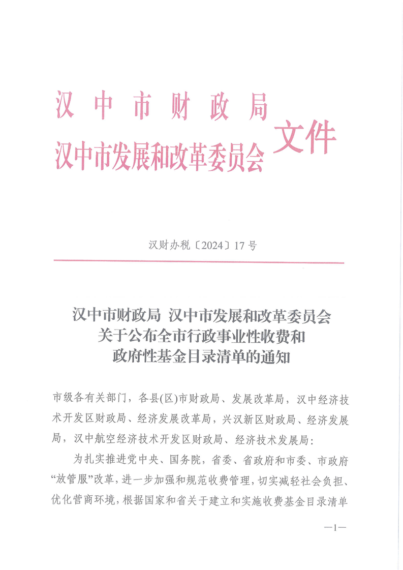 洋縣財政局 洋縣發展和改革局轉發《漢中市財政局 漢中市發展和改革委員會關于公布全市行政事業性收費和政府性基金目錄清單的通知》的通知 洋財發【2024】65號