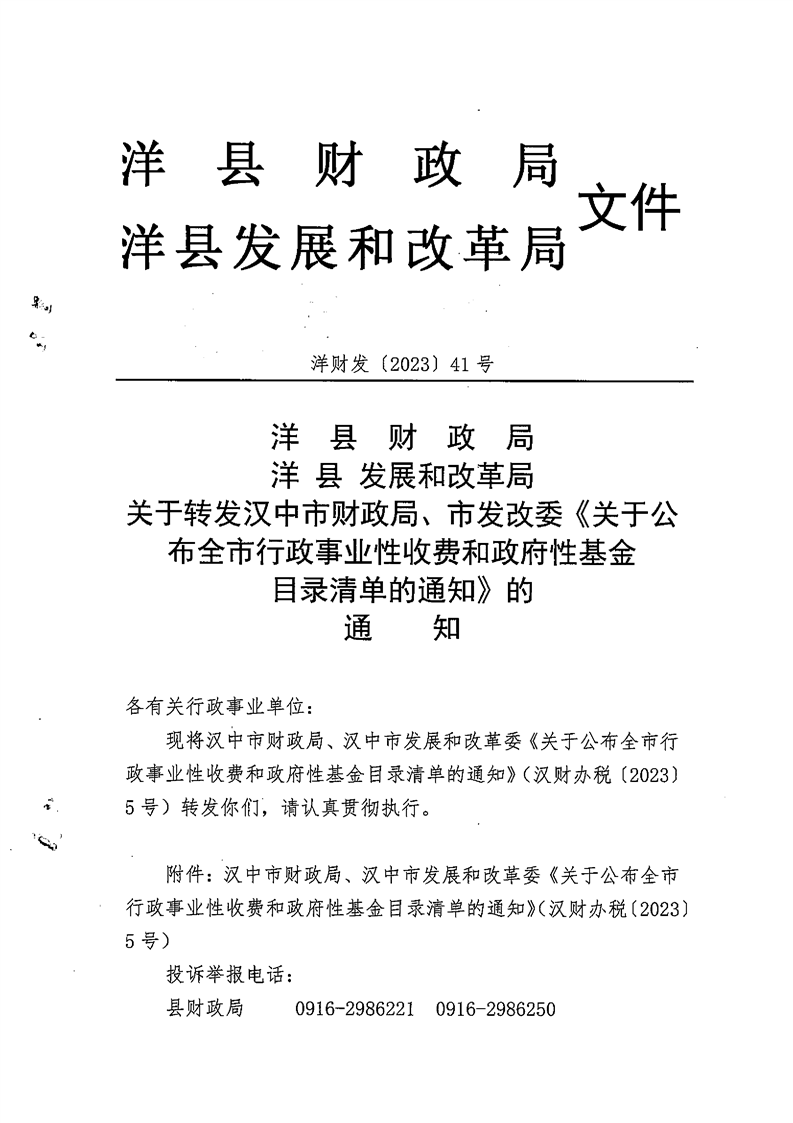 洋財發〔2023〕41號 關于轉發漢中市財政局、市發改委《關于公布全市行政事業性收費和政府性基金目錄清單的通知》的通知 |