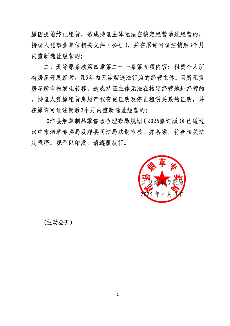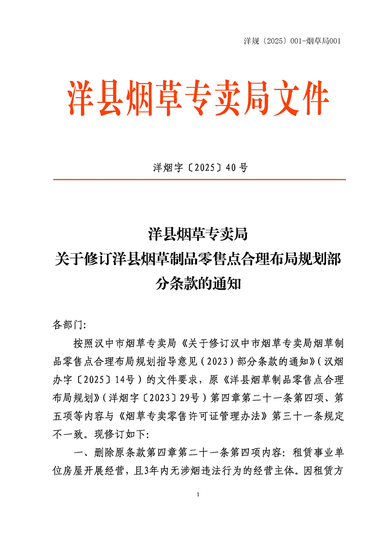 【有效】洋規〔2025〕001—煙草局001 關于修訂洋縣煙草制品零售點合理布局規劃部分條款的通知 |