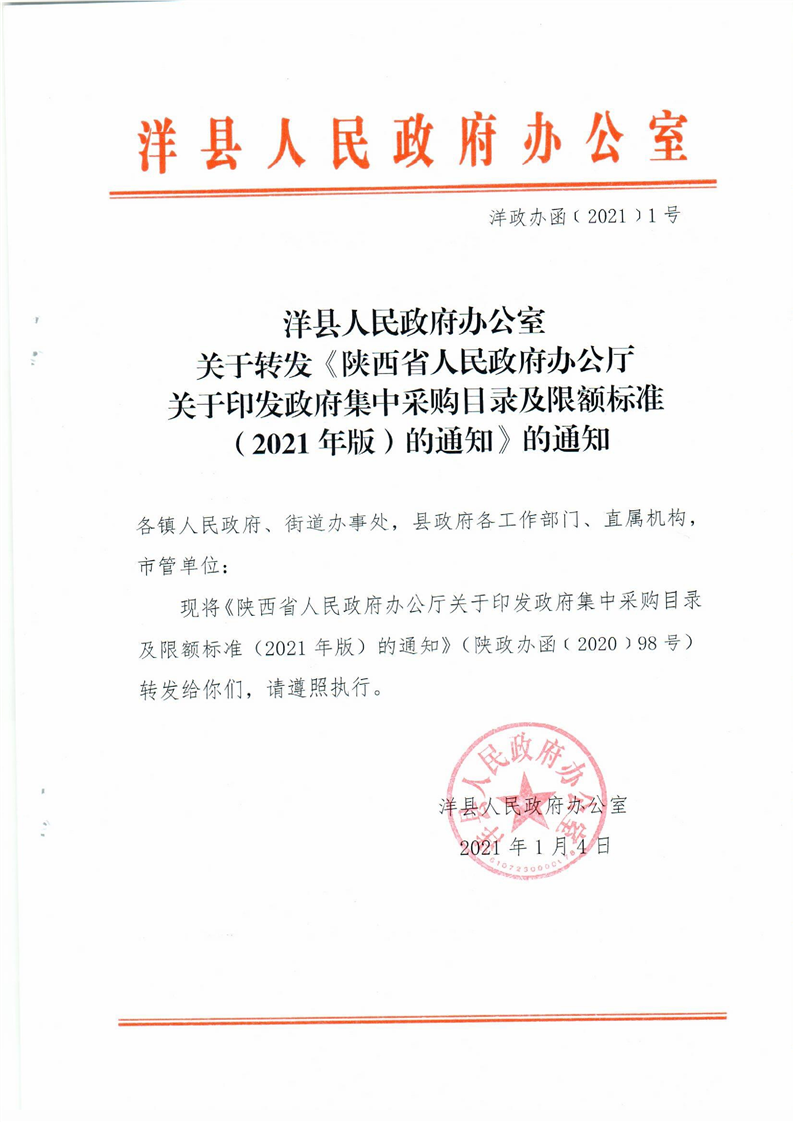 洋政辦函〔2021〕1號關(guān)于轉(zhuǎn)發(fā)《陜西省人民政府辦公廳關(guān)于印發(fā)政府集中采購目錄及限額標(biāo)準(zhǔn)(2021年版)的通知》的通知